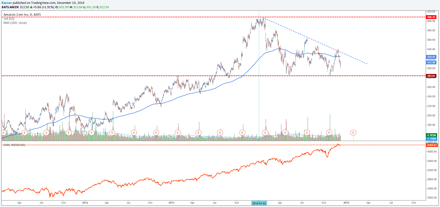 Let’s get back to what happened to the Amazon.com Inc. share price. It has been traded at a lower price comparing with the end of 2013. But taking into consideration everything we have told you in this article, we think that a rally is on the way. A dip back to 284 key level support would be a good opportunity to buy.