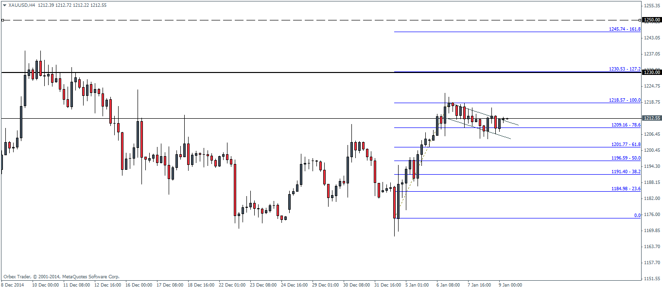 With the US Dollar turning choppy for most part of this week and with the FOMC meeting minutes putting off interest rate hikes towards the later part of Q2 2015, Gold futures remained choppy as well. However, at the time of writing, Gold prices looks poised to close the first trading week of the year on a bullish note, but still trading within the major monthly support resistance level of 1242 and 1181 with no clear decisive moves being made yet ahead of today’s December nonfarm payroll data, which could possibly shift the sentiment either way. With no major risks of any geo-political uncertainty, it is likely that the price action that follows in Gold could be purely based on today’s US jobs data and the ensuing price action that follows.
