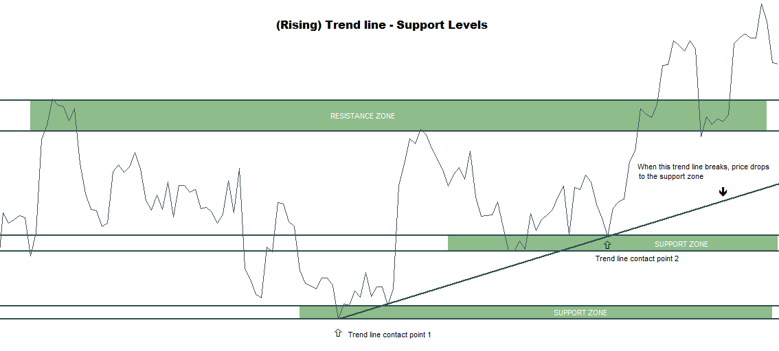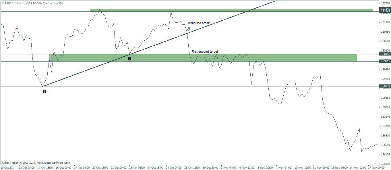 - The above chart illustrates the different ways the trend line break method can be used. In this example, if you would have missed the initial short position, notice how price formed resistance near the identified support level? This would be indication enough that price would drop lower to the next support level at point 1, which price eventually did.