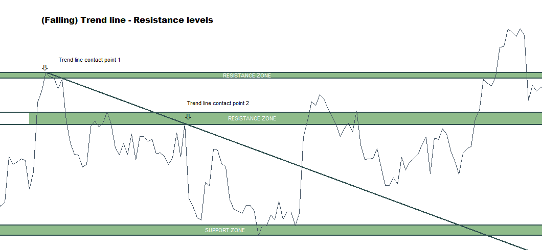 In the trend line break trading strategy, plotting horizontal support and resistance levels are relatively easy. Remember we said that we need at least two contact points to plot a trend line? Well these very contact points forms the support levels or resistance levels.
