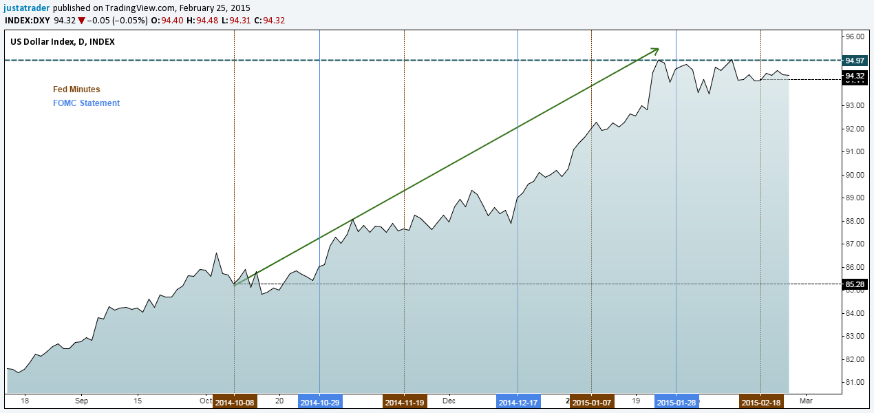 Sometimes, it becomes far too convenient to get swayed by the larger market emotions. But the truth is that markets can be irrational, even at times when you/we believe the markets are acting logically. And good evidence to this fact comes from the Dollar Index chart below. Notice the market reactions to both the FOMC statements as well as the minutes that follow, since the famed QE3 was ended in October 2014.