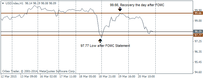 The intraday chart for the US Dollar Index shows a decline during the FOMC statement release, closing the day at lows of 97.77. The Greenback then recovered the next day to post a high at 99.66, but failed to break above the previous highs near 100. On Friday, 20th March, the Greenback yet again saw a sell off to close back within the lows of the 97.77.