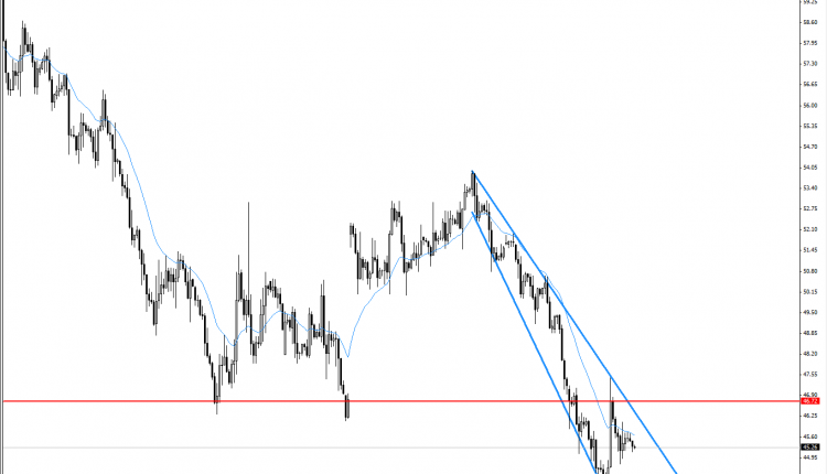 Market has corrected to 47s levels yesterday , but has been sold of once it touched the downtrend as shown on the chart ; the more downward pressure on oil still existing and market fundamental of energy sector has not been changed which mean the downtrend is expected – or to be more accurately expect a trading range between the 43 and 46.70 levels with downward slope of that range .
