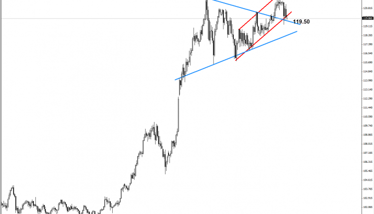 Market now on the testing phase on the symmetrical triangle on the daily chart as shown . The market after retested the previous high of 121s levels back again to re-test the broken continuation pattern . 119.50 /119.00 represent support area if market successfully rebound from that levels and crossed 120.50 then a more advance is expected to reach a level higher than the previous peak ; but if market declined more and entered the pattern once again ( less probable scenario ) then a range market would be the title for the coming weeks , a range between 121.50s levels and 116.50