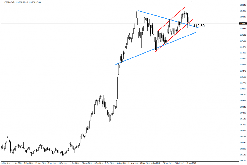 Market now on the testing phase on the symmetrical triangle on the daily chart as shown . The market after retested the previous high of 121s levels back again to re-test the broken continuation pattern . 119.50 /119.00 represent support area if market successfully rebound from that levels and crossed 120.50 then a more advance is expected to reach a level higher than the previous peak ; but if market declined more and entered the pattern once again ( less probable scenario ) then a range market would be the title for the coming weeks , a range between 121.50s levels and 116.50