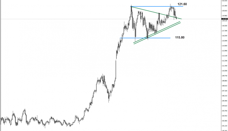 Market now on the testing phase on the symmetrical triangle on the daily chart as shown . The market after retested the previous high of 121s levels back again to re-test the broken continuation pattern . 119.50 /119.00 represent support area if market successfully rebound from that levels and crossed 120.50 then a more advance is expected to reach a level higher than the previous peak ; but if market declined more and entered the pattern once again ( less probable scenario ) then a range market would be the title for the coming weeks , a range between 121.50s levels and 115.80