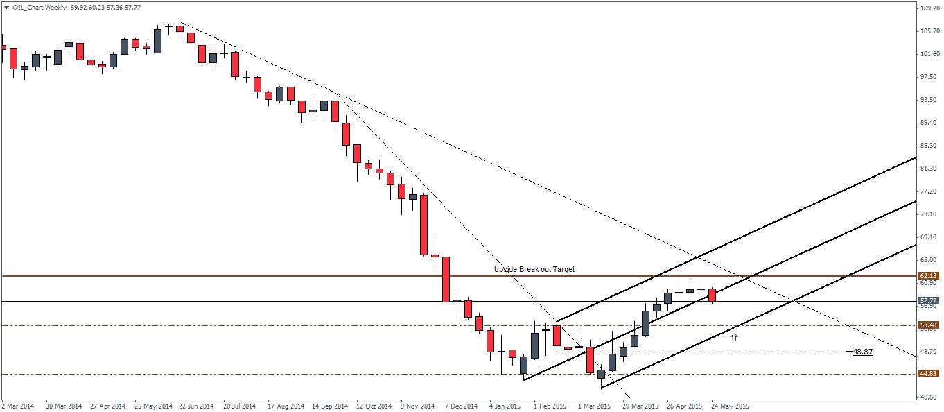 The weekly chart for Crude Oil shows the reason why as we notice the weekly candlestick closing with three weeks of near doji type of price action after a brief touch to the $62 price level. After three weeks of sideways price action, this week saw a reasonably bearish candlestick taking shape with still two sessions to go. The weekly chart shows that the support level comes in at 53.48 – 53.5 level which if holds could see another attempt for Crude Oil to push higher. A break below 53.5 will see Crude oil likely to decline lower towards 48.5 and could hint to the end of this corrective rally to 62.