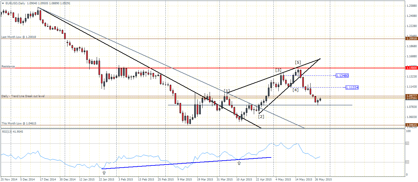 Looking to the RSI level, after the bullish divergence was confirmed, price rallied close to 1.148 and then dropped out of the rising wedge/triangle pattern. The support/resistance level at 1.09 – 1.1 will be now key as a close above this level will no doubt propel EURUSD towards 1.148 and possibly much higher.