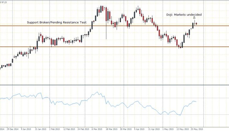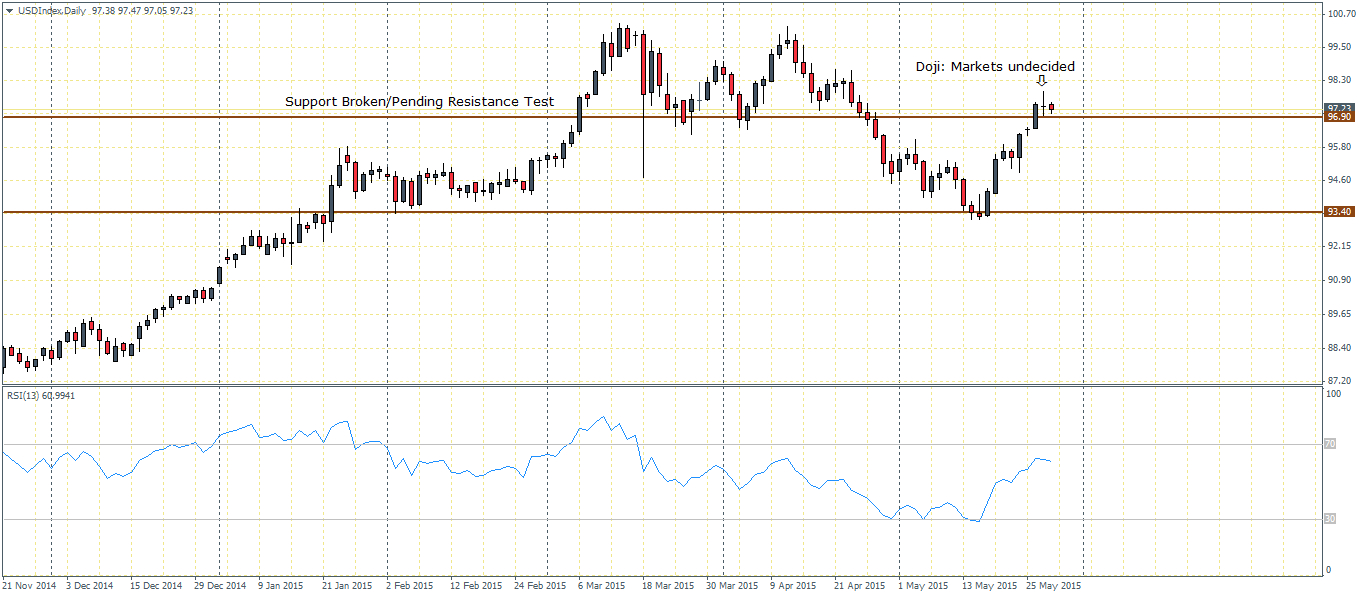 The daily chart for the US Dollar Index is probably the most interesting as price action managed to break above 96.9 support from the daily and formed a doji candlestick yesterday. A bearish close today, below 96.9 will be interesting one to watch as this could potentially spell the end of the correction to the minor downtrend and could in fact pull the Greenback lower.