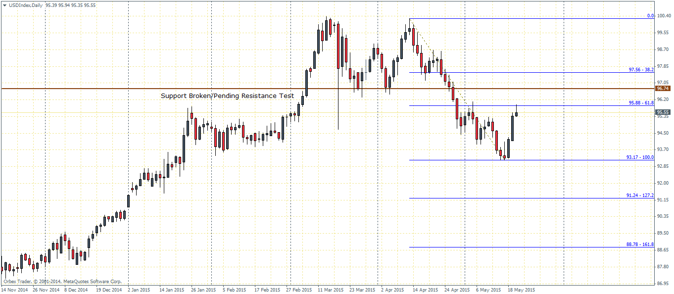 The US Dollar index has managed to turn around yesterday posting one of the strongest single day gains 14th April. However today’s price action is currently flirting near the 61.8% fib level of the recent declines, so the obvious question on everyone’s mind is whether this could mark the end of the retracement or if price could push higher towards the 30.2% Fib level at 97.56. We would prefer to see a daily close above or near the 61.8% Fib level and wait for some kind of bearish candlestick pattern to ascertain our view to the downside. That said, at this point, the Greenback still remains bleak.