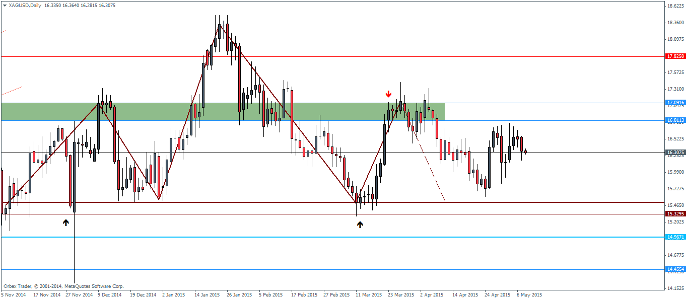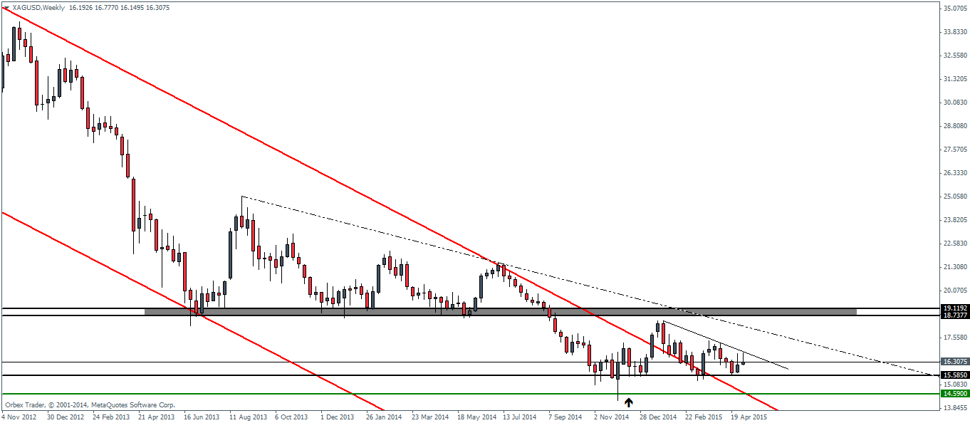 From the weekly charts, price action hasn’t really moved much in recent weeks and has been mostly ranging for its part. The minor trend line plotted connecting the highs from 25/01 through 05/04 this year should offer an initial glimpse into the price movements. A break above this minor trend line is a clear indication that from the weekly charts price could possibly test higher. Major support comes at 15.58 on the weekly charts which need to give way to validate the head and shoulders from the daily charts and thus target 13.31, the projected move in Silver futures based on the head and shoulders pattern.