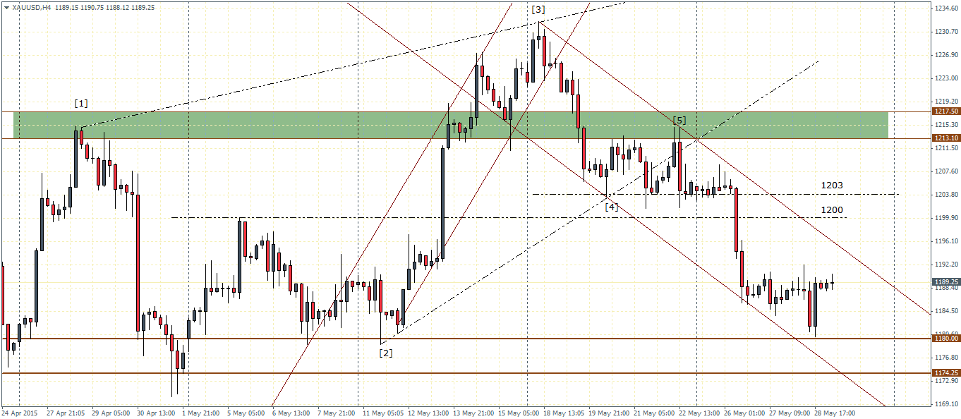 Looking to the 4-hour chart, we notice that price barely made it to a significant point 5 in the larger rising wedge/triangle pattern after prices were capped near the 1213 level of support/resistance. Eventually, Gold futures broke out from the triangle and broke below the 1199 – 1200 price level. At the time of writing, we notice a strong bounce from the 1180 support level although price didn’t completely dip to this support zone. We could therefore expect to see a retest to 1200 handle before prices eventually decline to the 1180 – 1174 price level.
