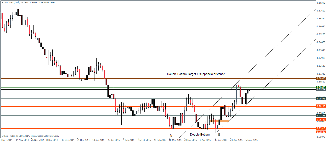 There is a risk that the AUDUSD could see further gains, when considering a longer term double bottom support near 0.7558 through 0.759 support zone. This double bottom gives an upside target to 0.809 with the neckline at 0.7887. It is interesting to note that the doji candlestick on the daily charts, formed just below 0.7887 levels and hence it wasn’t really surprising to see the current strength in the Australian dollar.