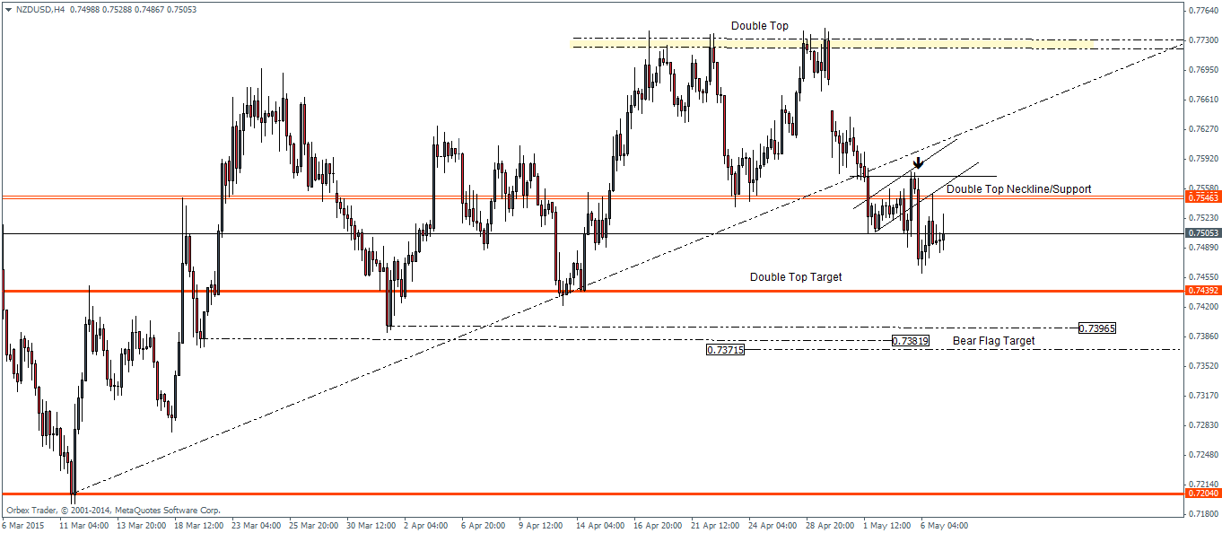 For the moment, the bear flag pattern identified after the break out of the trend line shows that the NZDUSD could move even lower towards 0.7396 through 0.7371 price levels.