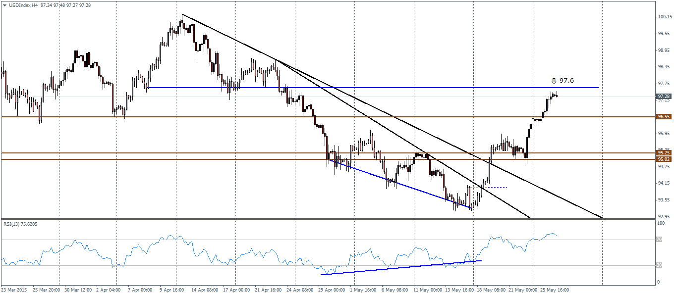 Switching to the 4-hour chart time frame, we notice that the bullish divergence to the RSI saw prices rally after seeking support near the 95.25 – 95 price level. The rally from this support took prices to break above 96.55 a 4-hour support level with the next resistance/support coming in at 97.6 after price managed to break across both the falling trend lines. From the 4-hour chart time frame, we expect to see a close above 97.6 and perhaps a test of support as well to ascertain that the US Dollar Index is indeed on its way to post fresh highs and could possibly break above the 100 psychological price level.