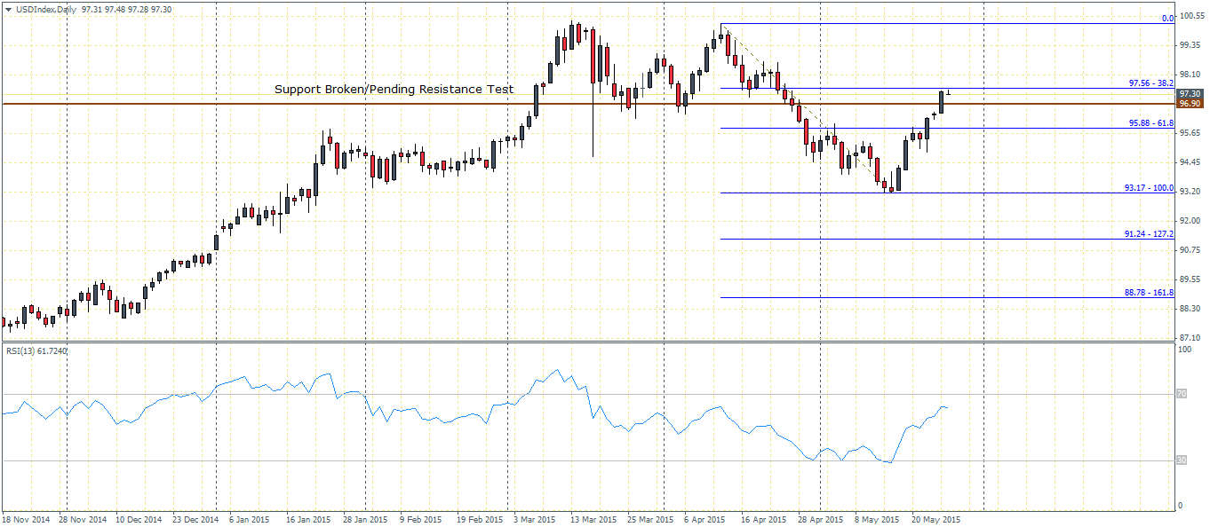 Looking forward, the main risk to the US Dollar comes from the second estimate revised GDP for the first quarter of 2015 which is due to be released this Friday. Expectations, heading into the event is for the revised GDP to show contraction by -0.9%. It will be hard to ascertain how the US Dollar would react to this news, which is already quite stale and considering that the most recent FOMC minutes and speech by Fed Chair Janet Yellen has largely overlooked this temporary slump. While the GDP data is likely to bring some volatility, combining the fundamental event with the technical levels mentioned earlier in this article could provide traders with some early clues into the future price action.