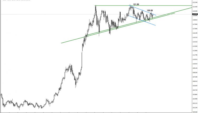 as market has recorded a higher price over 120 yen per us dollar , the upward for the longer term view is more probable , however , the market of this pair is also trading in a range awaiting more data to decide its mid-term course of action – so we do expect and see a range market sloping upward on the short-view as long as the market is trading higher than 117.80 . However , 121.50 considered the major mid-term resistance the breakout of that levels ( which is the most probable ) would push the market further upward .