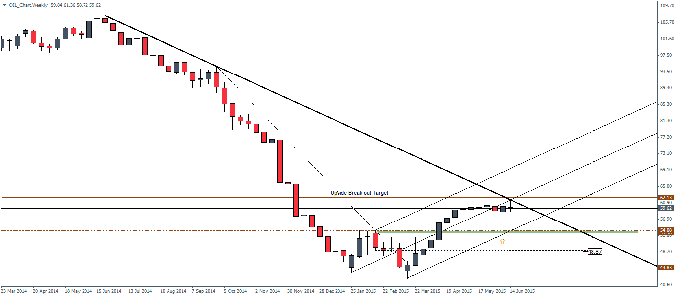 The prolonged sideways price action in Crude Oil is very indicative of a potential break out point being reached any time soon. The weekly chart also points to the risks of an upside breakout which shows price trading quite close to the major long term trend line. A break above this trend line is needed to ascertain any further gains in Crude Oil prices. To the downside, we notice that support is established near $53.5 region.