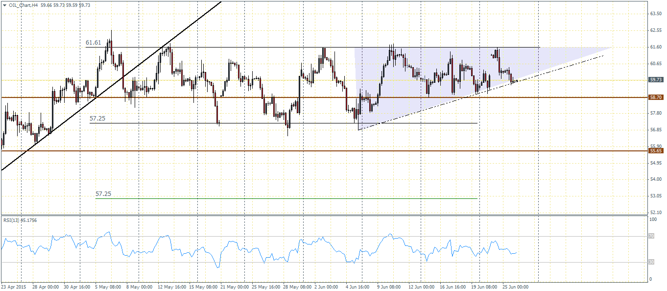 On the intraday charts, we notice a potential ascending triangle pattern being formed with price action currently testing the rising trend line. A break out above $61.61 could possibly set the stage for a continued rally to the upside. In the event the trend line is broken, support at $58.7 will be tested ahead of a decline down to 57.25. However, our bias remains to the upside should $61.61 breaks.