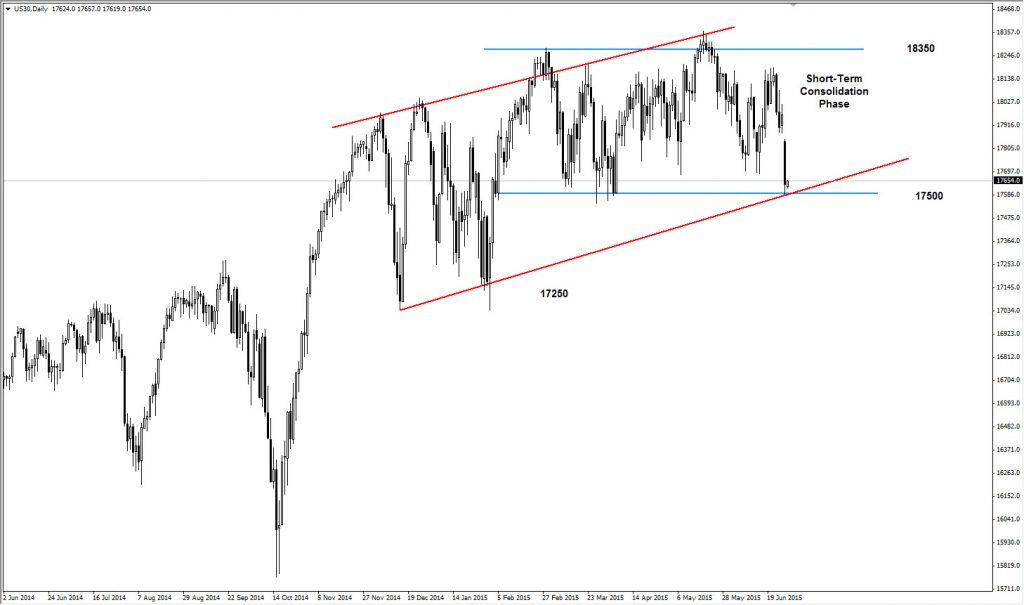 As shown on the chart the market is at the lower boundary of the rectangle patter ( the blue levels ) , and on the lower levels for the bigger rising channel at 17600/17500 levels , which would push the trader to long that position . However, if the coming NFP numbers or a negative development on the Greek Drama would support a negative breakout for the both patterns, in this case 17000s /16500s would be the target for that correction.