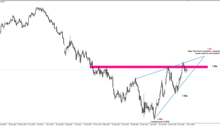 The pair on a major wide consolidation area, ranging between 1.52s and 1.60s level, as more of the major pair the ranging market which is expected to follow that correction. As shown on the chart; upward breakout of the 1.60s levels will create more demand for buying the sterling against the US dollar which would accelerate the move toward 1.65s levels.