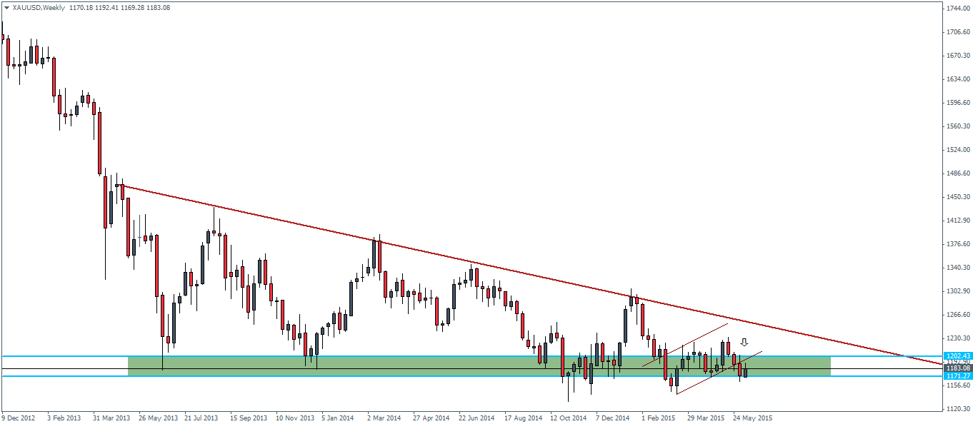 After posting declines for three straight weeks, Gold futures on the weekly chart is currently looking to form an inside bar, within the support zone of 1202 through 1171. Currently, Gold futures have gained over 1% for the week. This inside bar formation comes just after the break of the bearish flag pattern and we expect this rally to at the very least retest as high as 1200. As a precaution, a weekly close above the 1200 region will offer us early clues into a possible spike to the upside.