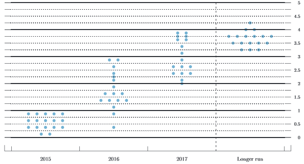 US Federal Reserve left interest rates unchanged while revising down its forecasts for 2015. The Fed expects to hike rates to the median forecasts of 0.675% by the end of the year 2015 indicating two rate hikes in store for 2015.