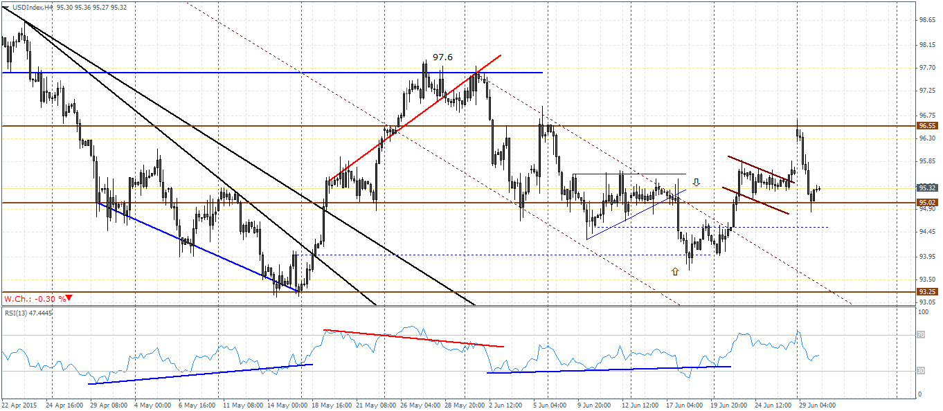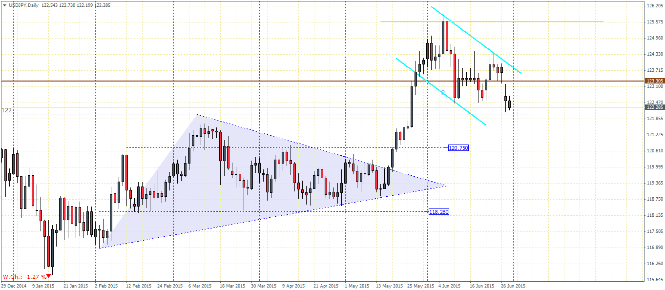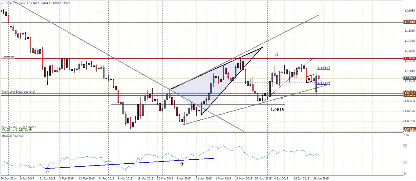 EURUSD (1.118): From last week’s mid-week technical update, EURUSD completed the bear flag pattern and dipped lower to support near 1.0977 – 1.0948 and closed on a bullish note yesterday. However, it is unlikely that we could expect a further rally to the upside as there is a potential for sideways trading for the next couple of sessions. There is an added noise of US economic data, but the Euro could simply wade through the noise while continuing its holding pattern into July 5th Greek referendum. We do however see a bias to the upside from a purely technical perspective. The test of support at 1.095 (rounded off) is indicative of a possible break higher. In this aspect, a test to 1.148 is very likely, but needs to be confirmed on a breakout from the range high and low from yesterday’s price action at 1.12775 – 1.0953.
