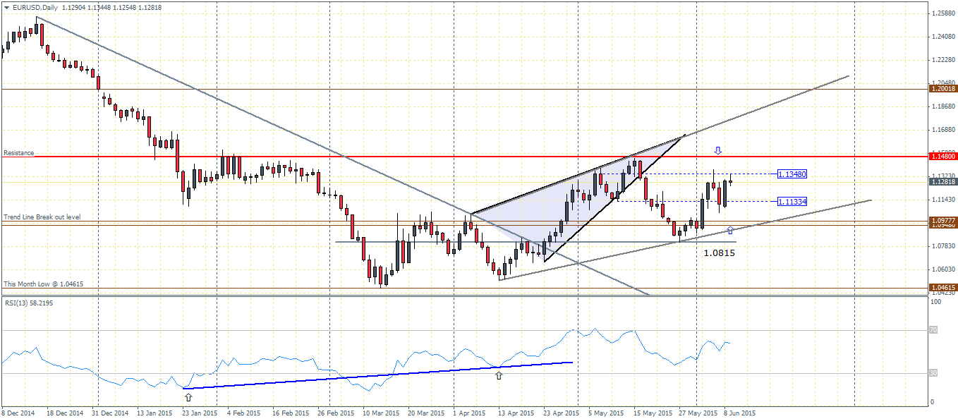 EURUSD (1.1287): After the quick drop from the rising wedge/triangle pattern, EURUSD found support near 1.0977 region and promptly saw a reversal from here around 27th May 2015. The bullish engulfing candlestick pattern from this support level gave the first indication that EURUSD had potentially formed a bottom near the 1.045 region and that new support was established at 1.097 – 1.10 level of support.