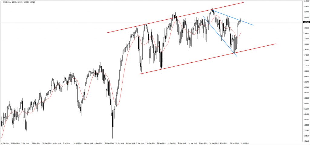 As shown on the chart the market is at the lower boundary of the rectangle patter ( the blue levels ) , and on the lower levels for the bigger rising channel at 17600/17500 levels , which would push the trader to long that position . However, if the coming NFP numbers or a negative development on the Greek Drama would support a negative breakout for the both patterns, in this case 17000s /16500s would be the target for that correction.