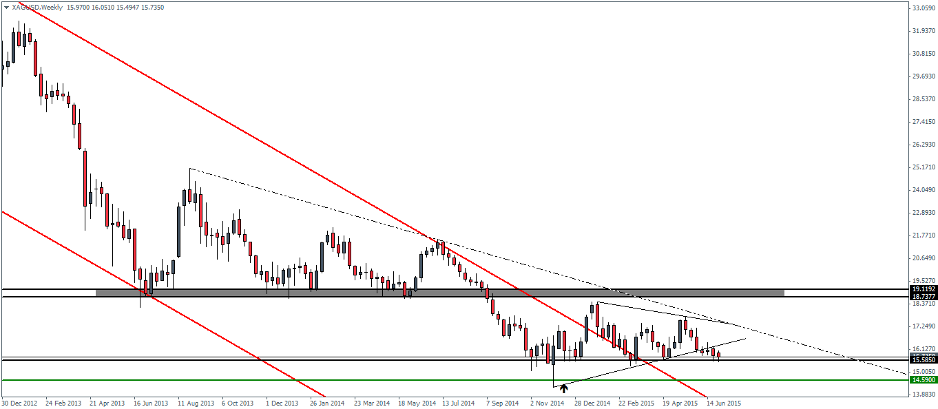 On the weekly charts, the bias to the downside is starting to be realized as the break of the symmetrical triangle is slowly taking shape. However, as noted in previous analysis, the support at 15.58 is proving to be a strong resistance to break and one which could keep prices trading sideways for a while. A confirmed break below 15.6 is needed in order for Silver to target the next support at 14.6.