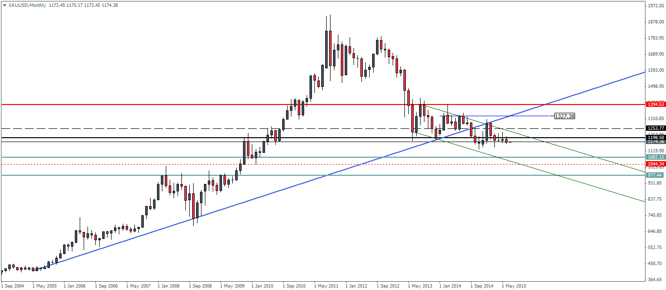 Starting with the monthly charts for Gold futures, we notice that the month of June saw Gold prices turn modestly bearish, closing on a bearish engulfing note. The fact that this price action pattern comes just below 1198 support from the monthly charts indicates that further downside is yet to come, with the potential to drop to 1082.