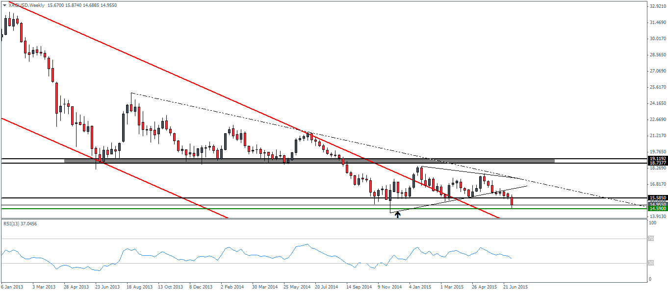 For the week, Silver prices lost close to -4.8% as prices touched a fresh yearly lows at 14.81. On the weekly chart, price is still trading within the falling price channel and the most recent decline shows confluence with the lower rails of the price channel, indicating rejection of prices at this level. The support at 14.95 incidentally was previously tested in late November 2014 and marks a test of this support level for a second time in years.