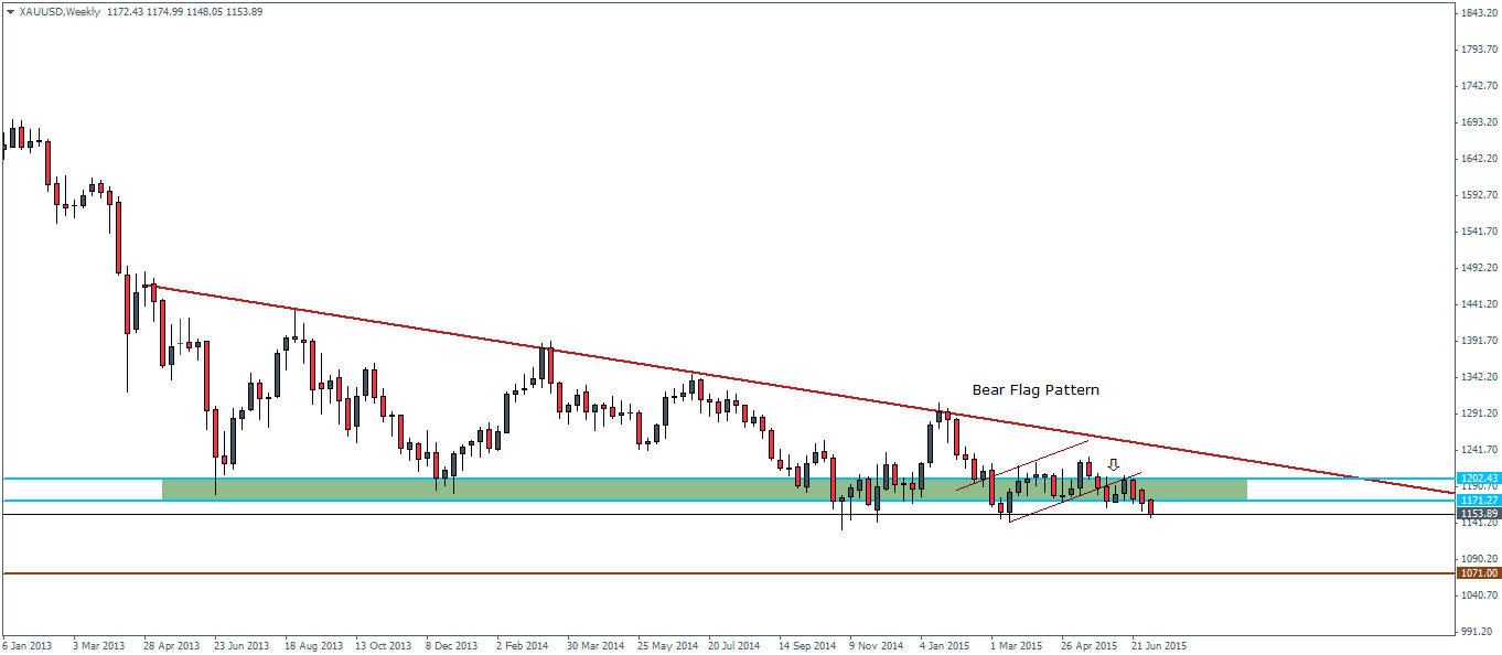 Gold futures were down this week, trading -1.25% lower since Monday’s open. Prices fell sharply as Gold tested the lows of 1150. The drop in prices comes despite the geo-political uncertainty surrounding Greece and its debt crisis. With the monthly candlestick charts printing a bearish engulfing pattern, Gold prices are likely to decline in the near term with the eventual support on the monthly charts coming in between 1170 – 1082.