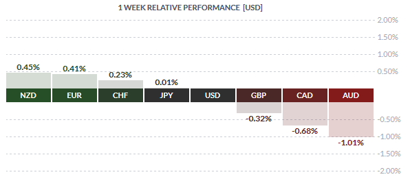 The Aussie and the Canadian dollar were the weakest currencies this week losing on average -1% and -0.6% for the week. The Canadian dollar was weaker, tracking Crude Oil prices which fell to fresh lows after weeks of trading sideways for the most part.