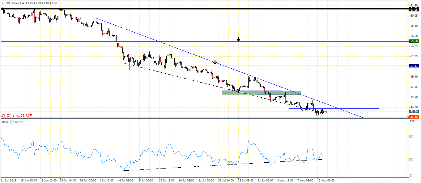 On the 4-hour chart time frame, we are noticing that the current declines are not being confirmed by the RSI as the bullish divergence is continuing to build up. We notice a minor resistance at 43.86 – 43.85 region. A break above this level and potentially establishing support here could see the start of the correction that will possibly see Crude Oil rally towards $51.30 level of support eventually. Ahead of the correction to $51, we expect the minor resistance levels near 46.3 – 47 being the initial point of target for the correction.
