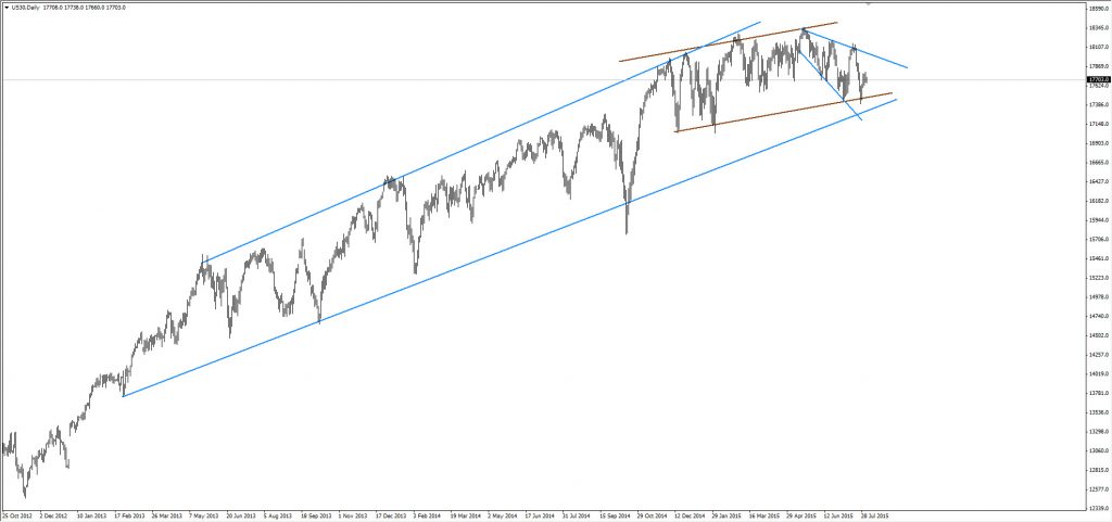 As shown on the chart the market is at the lower boundary of the rectangle patter ( the blue levels ) , and on the lower levels for the bigger rising channel at 17600/17500 levels ( Penetrated it already ! ), which would push the trader to long that position . However, if the coming NFP numbers or a negative development on the Greek Drama would support a negative breakout for the both patterns, in this case 17000s /16500s would be the target for that correction.
