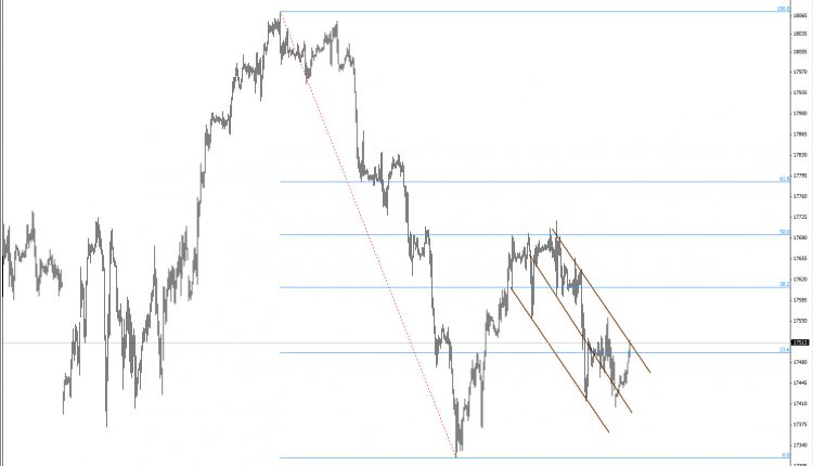 As shown on the chart the market is at the lower boundary of the rectangle patter ( the blue levels ) , and on the lower levels for the bigger rising channel at 17600/17500 levels ( Penetrated it already ! ), which would push the trader to long that position . However, if the coming NFP numbers or a negative development on the Greek Drama would support a negative breakout for the both patterns, in this case 17000s /16500s would be the target for that correction.