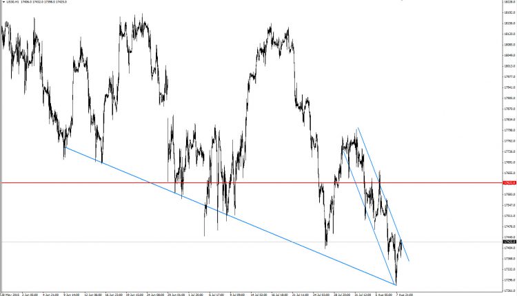 As shown on the chart the market is at the lower boundary of the rectangle patter ( the blue levels ) , and on the lower levels for the bigger rising channel at 17600/17500 levels ( Penetrated it already ! ), which would push the trader to long that position . However, if the coming NFP numbers or a negative development on the Greek Drama would support a negative breakout for the both patterns, in this case 17000s /16500s would be the target for that correction.