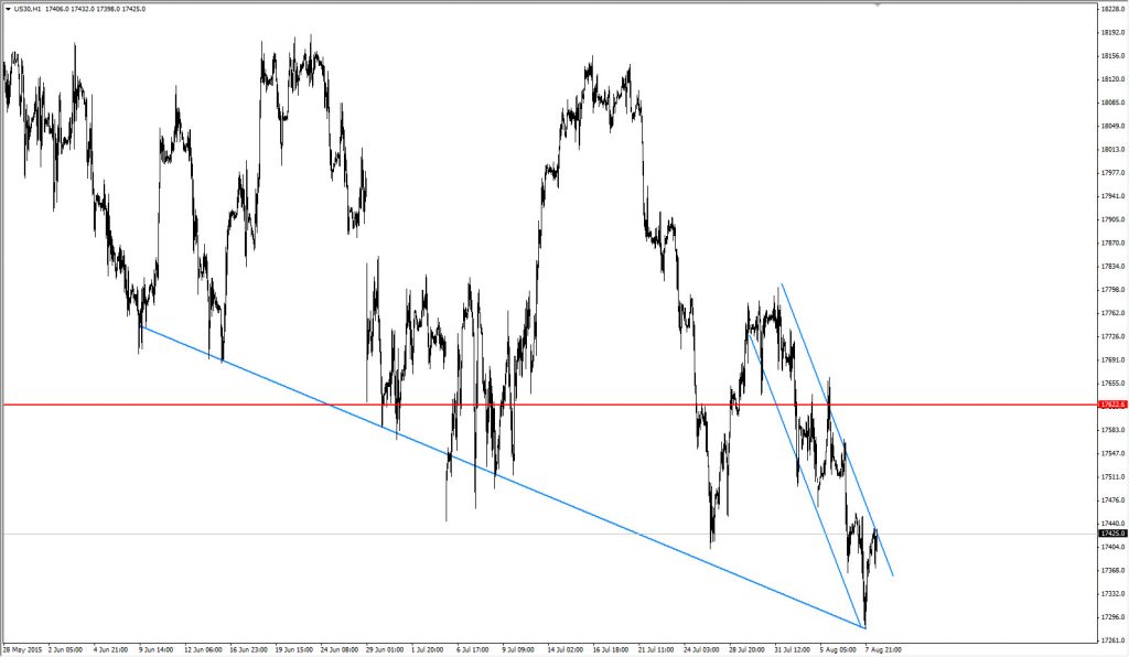 As shown on the chart the market is at the lower boundary of the rectangle patter ( the blue levels ) , and on the lower levels for the bigger rising channel at 17600/17500 levels ( Penetrated it already ! ), which would push the trader to long that position . However, if the coming NFP numbers or a negative development on the Greek Drama would support a negative breakout for the both patterns, in this case 17000s /16500s would be the target for that correction.