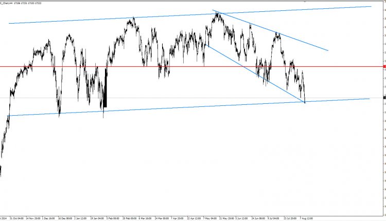 As shown on the chart the market is at the lower boundary of the rectangle patter ( the blue levels ) , and on the lower levels for the bigger rising channel at 17600/17500 levels ( Penetrated it already ! ), which would push the trader to long that position . However, if the coming NFP numbers or a negative development on the Greek Drama would support a negative breakout for the both patterns, in this case 17000s /16500s would be the target for that correction.
