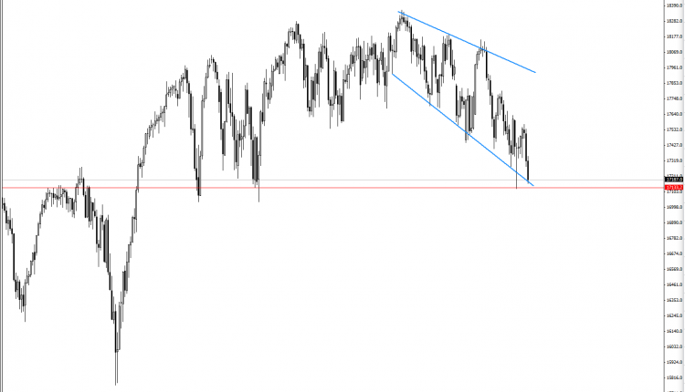 As shown on the chart the market is at the lower boundary of the rectangle patter ( the blue levels ) , and on the lower levels for the bigger rising channel at 17600/17500 levels ( Penetrated it already ! ), which would push the trader to long that position . However, if the coming NFP numbers or a negative development on the Greek Drama would support a negative breakout for the both patterns, in this case 17000s /16500s would be the target for that correction.