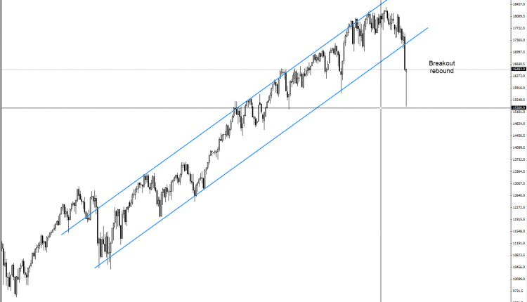 As shown on the chart the market is at the lower boundary of the rectangle patter ( the blue levels ) , and on the lower levels for the bigger rising channel at 17600/17500 levels ( Penetrated it already ! ), which would push the trader to long that position . However, if the coming NFP numbers or a negative development on the Greek Drama would support a negative breakout for the both patterns, in this case 17000s /16500s would be the target for that correction.