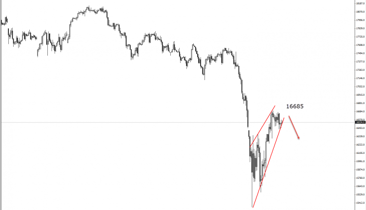 As shown on the chart the market is at the lower boundary of the rectangle patter ( the blue levels ) , and on the lower levels for the bigger rising channel at 17600/17500 levels ( Penetrated it already ! ), which would push the trader to long that position . However, if the coming NFP numbers or a negative development on the Greek Drama would support a negative breakout for the both patterns, in this case 17000s /16500s would be the target for that correction.