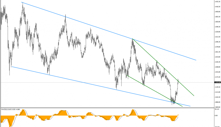 The market succeeded to reach the bearish channel’s resistance after breaching 1145 levels ( Penetrated it already ! ), which succeeded to reach strength to the resistance at 1165.00. We prefer to stay aside temporarily in order to monitor the price behavior according to the key levels represented by 1165 resistance and 1125 support, as breaching this resistance will extend gains on the short term basis to head towards 1185 then 1200 and extend to 1230, while breaking the support represents negative factor that will keep trading inside the bearish channel, and the negative targets begin with breaking the support at 1125.00 and extend to 1080.00.