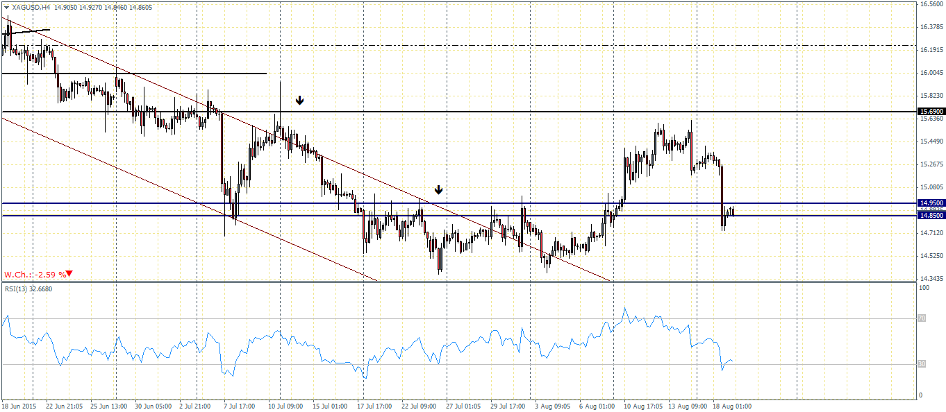 On the daily charts, the longer term head and shoulders pattern remains in play although the price action last week has shown a test to the head and shoulders neckline at 15.51. To the downside, a break below current lows at 14.75 will most likely see Silver break down to post new multi-year lows with the eventual target to 13.768