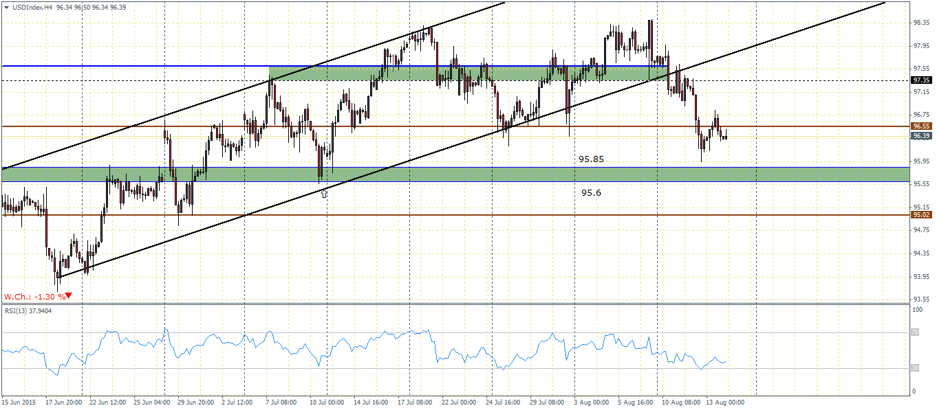 On the 4-hour chart time frame, the declines were marked by a downside break out from the rising price channel. We notice a minor bounce back to the 96.55 region of support/resistance but the declines could see a test of support near 95.85 through 95.60. Price action at this support could prove to be crucial as failure to support prices could spell further weakness in the Greenback.