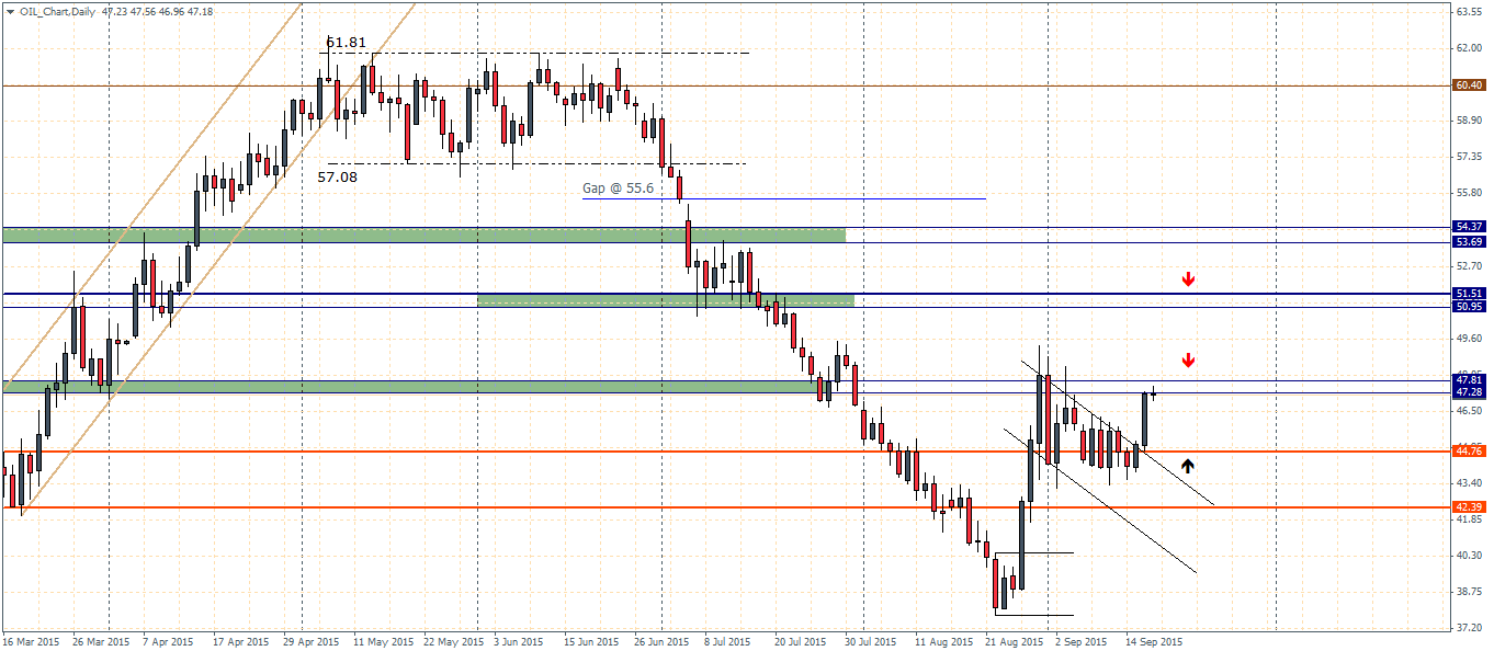 On the weekly chart, after two weeks of consolidation, Crude oil is attempting to close on a bullish engulfing note. Therefore, if we see a weekly close at or above current levels of 47.20, we could anticipate a further continued upside moment. On the weekly charts, the next main resistance is seen at 54. However, considering that prices are still trading below the falling trend line, a rejection at 54 could see prices decline back to lower levels towards 44.83.