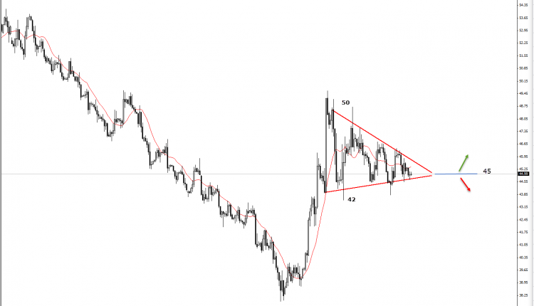 On the mentioned time horizon we would consider the levels of 42 and 50 US dollar per barrel, as the major playable levels for the oil, once the prices penetrated on of these price the market would continue its penetration to a mid-term trend. In case the market broke upward the price of 50 then our target would be at 55/58. However, a downward breakout below 42 US dollar we would see a long time market below 40 levels at 38/35/32 which considered the major support.