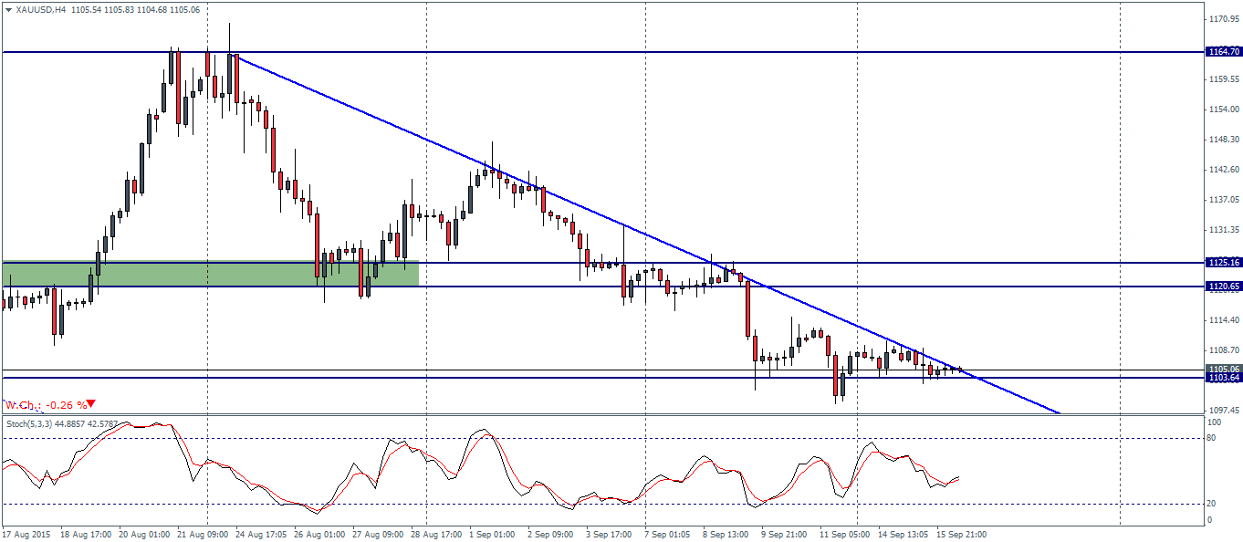 On the H4- Chart time frame, Gold futures have been consolidating near the support level of 1103. Comparing the price action near the support level to the Stochastics oscillator, we can see a bullish divergence building at this level. The correction to the upside could see a rally that will retest the 1120 – 1125 support/resistance level off the lower support near 1103. This view is further reiterated by the falling trend line and the proximity of price to this trend line. A potential break off the falling trend line could likely trigger some buying in Gold towards 1120 in the short term.